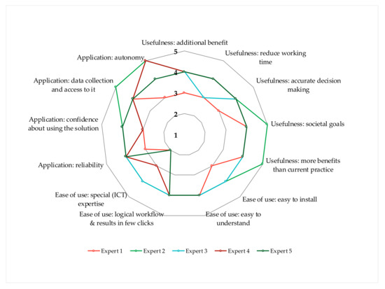 Responses of experts regarding the usefulness, ease of use and application of the smart farming solution. A 5-point Likert scale ranging from strongly disagree (1) to strongly agree (5) was used.