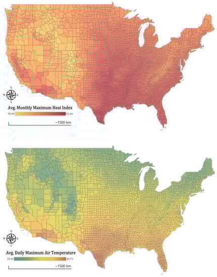Before discussing heat waves and their impacts on people, it is important to correctly understand the definition and related measures of heat events. Like the Fujita-scale for tornadoes, there is a heat index measure for heat waves. The United States National Oceanic and Atmospheric Administration National Weather Service (NOAA NWS) defines the heat index as “a subjective measure of what it feels like to the human body when relative humidity is factored into the actual air temperature”. This implies that heat events result from a combination of high temperatures and high humidity. Figure 1 compares the summertime average maximum heat index (i.e., apparent temperature) and the average daily maximum temperature. The figure clearly shows that temperature alone does not fully explain the risk of heat across the USA regions. Compared to dry hot areas in the Western region of the USA that includes states such as Nevada, Utah, and New Mexico, humid regions in the Midwest and Eastern USA have relatively higher heat index values. Excessive heat or heat events occur as reported in the NOAA Storm Events Database whenever heat index values meet or exceed locally/regionally established excessive heat warning or heat advisory thresholds, respectively. The definition/determination of heat and excessive heat are provided in Table A1 in the Appendix A. The Storm Events Database managed by NOAA’s National Centers for Environmental Information (NCEI) is available at https://www.ncdc.noaa.gov/stormevents/ftp.jsp.
