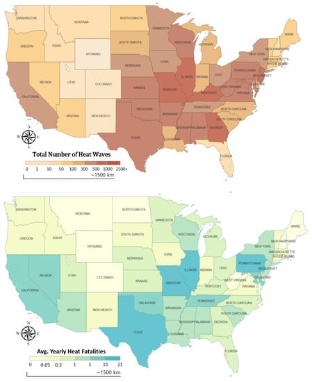 Heat waves are the deadliest type of natural hazard among all weather extremes in the United States (USA). Every year, more than 1000 heat events occur, causing an average of 131 direct heat fatalities during the last twenty years. However, excess heat exposure contributes to a far greater number of deaths, directly and indirectly—658 deaths per year on average during the years 1999–2009 according to National Center for Health Statistics (NCHS) [1]. The risk of extreme heat has been elevated in many regions of the world including the USA as extreme weather phenomena is increasing in both frequency and magnitude under global climate change [2,3]. The observed and predicted shifts in the variability and intensity of weather extremes that are driven by climate change, such as heat waves, flooding, droughts, and tornadoes have been discussed in many scientific studies [4,5,6,7]. With regard to heat events, [4] and [6] predict that future heat waves in North America will occur more frequently with greater intensity and longer duration. [8] estimates that extreme temperatures due to climate change will result in a loss of 1.3 million life-years annually in the USA by the end of 21st century.