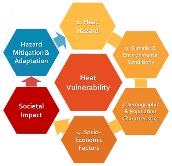 Based on the conceptual framework presented in Figure 3, we propose that the major components that determine vulnerability to heat hazards include the: (i) Heat hazard profile; (ii) climatic and environmental conditions; and (iii) demographic and socio-economic characteristics. In addition, we consider institutional mitigation and adaptation efforts as an external factor that influences and interacts with heat vulnerability.