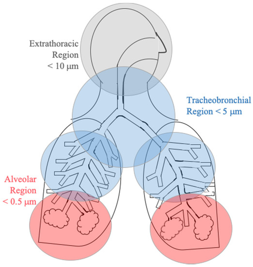 Understanding the pattern and probability with which airborne particles deposit in the human respiratory tract is important for characterizing the respiratory tract loading and the resulting risk of developing health problems due to inhalation exposures [1,2]. Of particular concern are airborne biological agents or bioaerosols—airborne particles of biological origin, including viruses, bacteria, molds, spores, and their fragments [3,4]. Exposure to bioaerosols may cause adverse respiratory conditions when such particles deposit in the respiratory tract in sufficient quantities. Workers who have been occupationally-exposed to bioaerosols have been found to have adverse health outcomes such as decreased lung function [5]. Furthermore, even low or background level exposure to bioaerosols may be associated with adverse health outcomes ([6] and references therein). For instance, the presence of Penicillium mold spores in indoor air has been associated with increased asthma risk [7]. Ubiquitous fungi genii such as Aspergillus and Penicillium may cause chronic sinusitis via an abnormal immune response [8], and one species of Aspergillus has been associated with increased severity of asthmatic reactions [9,10,11]. Furthermore, species such as Bacillus anthracis (anthrax-causing bacteria) can penetrate into the alveoli [12], survive in the macrophages [13], and may cause death [14,15].