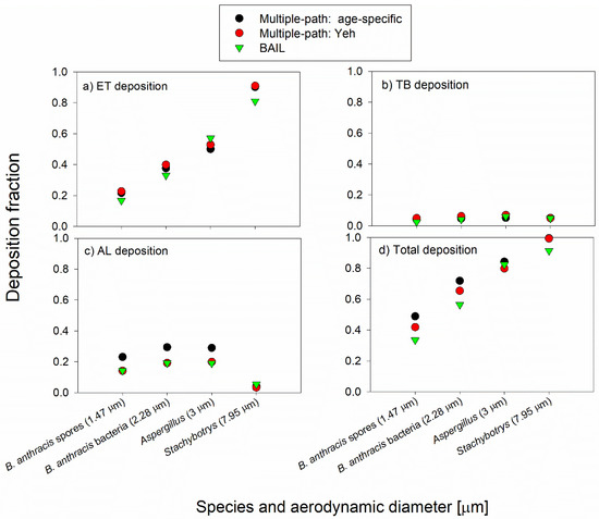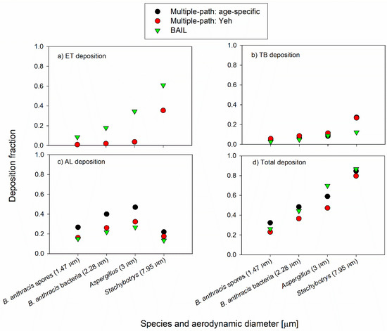 On the other hand, the alveolar deposition was usually lower in BAIL than in the multiple-path models. In the default scenario, BAIL’s AL region deposition fractions were almost identical to the Yeh model but lower than the deposition fractions from the age-specific model (Figure 2c). In the light exercise and mouth-breathing scenarios, BAIL calculated a lower deposition fraction in the AL region compared to the multiple path models (Figure 3c and Figure 4c). For bioaerosols such as B. anthracis spores, which are most dangerous when they reach the deep lungs, capable of causing inhalation anthrax [36], our results from BAIL imply that risk, based on this model, is reduced compared to the risk-based on the two multiple-path models since a smaller fraction of the inhaled spores may be reaching the AL region. Likewise, BAIL suggests a potentially reduced health risk from inhalation of A. clavatus, which is associated with inflammation of the alveoli in hypersensitivity pneumonitis [11]. However, as microorganisms may be part of larger, agglomerated particles, a lower predicted AL deposition does not preclude disease development [14,37]. Increasing and decreasing FRC and V in the multiple path models by 20% from the values calculated by BAIL resulted in some changes in regional deposition (Table 3) but did not affect the overall deposition profile as a function of particle size. The relative deposition fractions between BAIL and the multiple-path models remained largely unaffected, suggesting that the multiple-path models have a low degree of sensitivity to the subject breathing parameters used in this study.