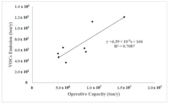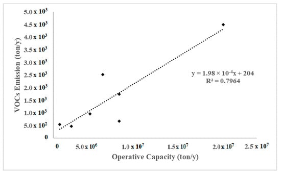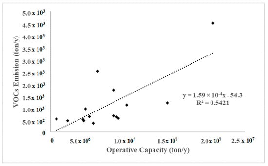 In addition, for the European scenario (setting aside the Italian plants), data concerning the operational capacity and VOC emissions for European refineries were collected, and their trend is illustrated in Figure 2. The resulting value of R2 value was equal to 0.79.