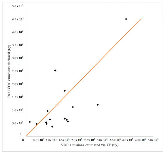 The average value (µ) relevant to the analyzed sample was equal to 188 g of VOC emitted per ton of oil treated, which can be considered as the EF for the total VOC emissions relevant to Italian and European refineries. Under this assumption, it is possible to re-calculate the total VOC emissions of the plants considered for this study by using this EF and multiplying it by the operational capacity of each refinery. The total VOC emissions re-calculated based on the EF estimated in this study and the real VOC emissions declared by the plant operators were then compared by means of a Q–Q (Quantile–Quantile) plot test [46] (Figure 4).
