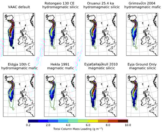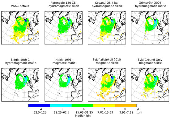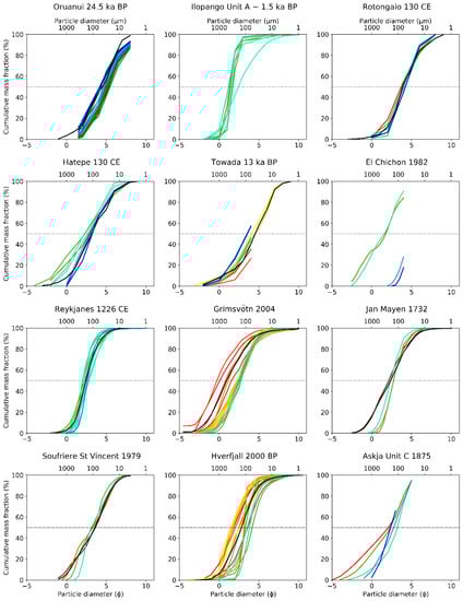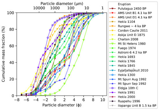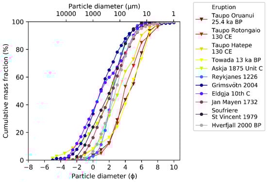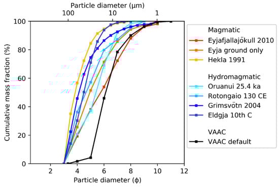 We selected TGSDs from four hydromagmatic eruptions that cover the range of coarse to fine TGSDs (Eldgja, Grímsvötn 2004, Rotongaio and Oruanui). In addition, one fine (Eyjafjallajökull 2010) and one coarse (Hekla 1991) magmatic TGSD were included. The Eyjafjallajökull 2010 TGSD is compiled from both ground samples and satellite data [33] and so, to investigate the impact of including satellite retrievals in TGSDs, we also added the Eyjafjallajökull 2010 TGSD derived only from ground samples (Figure 8).