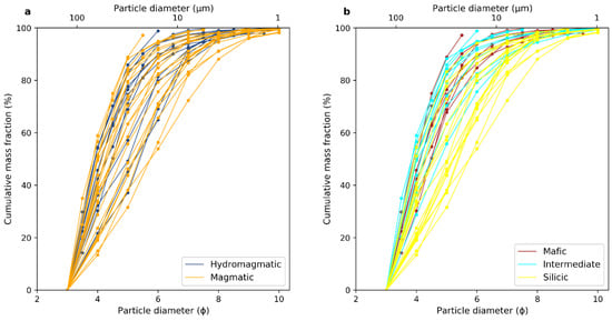 Figure 1 and Figure 2 show TGSDs for the hydromagmatic and magmatic eruptions listed in Table 1 and Table 2, respectively. The eruptions cover a wide range of magma compositions from mafic (basalt, ≤ 52% SiO2) and intermediate (basaltic andesite—andesite, 52%–63% SiO2) to silicic (dacite—rhyolite, > 63% SiO2). Hydromagmatic eruptions show a smaller range of grain sizes than magmatic eruptions, with medians from 0 to 4 Φ (62.5–1000 µm), with the larger eruptions (which are also all silicic), e.g., Taupo Oruanui, Rotongaio and Hatepe and Towada (all VEI ≥ 6) having the finest TGSDs. The magmatic eruptions have median values of −2–4 Φ (62.5–4000 µm). However, when we consider only particles likely to be in the distal ash cloud (> 3 Φ, < 125 µm), TGSD is not a significant indicator of the presence of external water, with a large overlap between hydromagmatic and magmatic eruptions (Figure 3a). Magma composition and VEI seem to be more significant, with lower VEI and mafic or intermediate eruptions having generally coarser TGSDs than silicic ones (Figure 3b). The link between eruption size and magma composition is expected, both because melt viscosity (which depends on composition) affects vesiculation kinetics (e.g., [13]), and the largest explosive eruptions tend to be silicic. A limitation of this analysis is that we are not aware of any published TGSDs for large (VEI ≥5) mafic or intermediate-composition hydromagmatic eruptions.