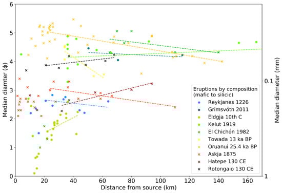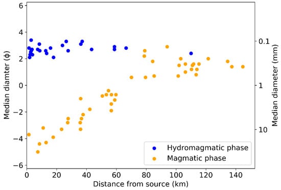 The only dataset which has sufficient samples to allow a robust comparison of the hydromagmatic and magmatic phases from the same eruption is from Askja 1875 (units C and D, respectively; [36]). Figure 6 shows a more constant median for the hydromagmatic phase of this eruption than for the magmatic phase, where there is a significant fining with increasing distance from the vent. Other median grain sizes for the hydromagmatic and magmatic phases from the same eruption are included in Supplementary Materials Section S2; for Eldgja 10th century and Ilopango ~1.5 ka BP, samples from > 20 km from source are available for only one phase and for Grímsvötn 2011, there are only three hydromagmatic data points, prohibiting robust conclusions.