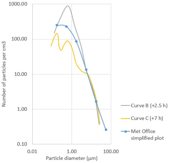Particle number size distributions in emissions from Mount Redoubt, January 8, 1990 eruption. Curve B: 4.0 km above sea level (asl), ~130 km downwind and ~2.5 h after eruption. Curve C: 2.6 km asl, ~170 km downwind and ~7 h after eruption [15]. Met Office simplified plot is used for NAME default particle size distribution from data in [72].