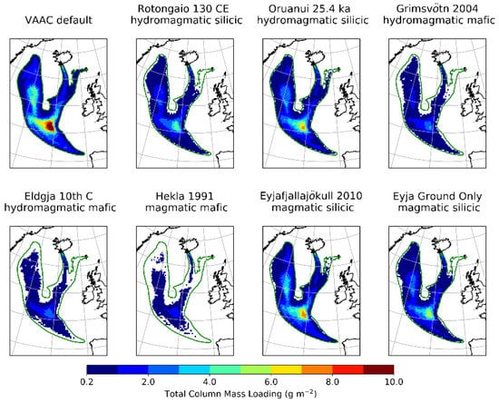 Ash clouds from explosive volcanic eruptions can travel huge distances and cause severe disruption to air traffic (e.g., [1]). To mitigate against aircraft encounters with ash clouds, Volcanic Ash Advisory Centres (VAACs) issue Volcanic Ash Advisories (VAAs) and Volcanic Ash Graphics (VAGs) which indicate the expected location of the ash cloud up to 18 h ahead. In Europe, there is an additional requirement to provide forecasts of ash concentrations [2]. As part of their forecasting process, the VAACs use atmospheric dispersion models to simulate the transport, dispersion and removal of ash from the atmosphere [3,4,5]. Where ash falls as individual particles, residence time in the atmosphere is controlled by particle parameters (grain size, density and shape), vertical advection and turbulence. Grain size is typically the dominant particle parameter in controlling the ash settling velocity and whether the ash residence time is significantly affected by turbulence [6,7,8,9,10]. It is, therefore, important to select an appropriate particle size distribution (PSD) to initialise model runs, but data on the size distribution of ash are rarely available in near real time and so most VAACs use default PSDs (e.g., [3,11,12]). In addition, many assume that only the smallest particles survive near-source removal processes, i.e., they only consider particles with diameters, e.g., ~< 100 µm (e.g., [3,4]). All of the ash in the air eventually falls to the ground and previous studies of the deposits show that grain size distribution varies greatly between eruptions, reflecting eruption intensity, magma composition and whether the eruption is wet or dry (hydromagmatic or magmatic) (e.g., [13,14]). It is still not clear how best to set a default PSD when measurements are not available. In this study, we test the sensitivity of modelled ash plumes to the input PSD and investigate how best to apply default PSDs in operational dispersion modelling.