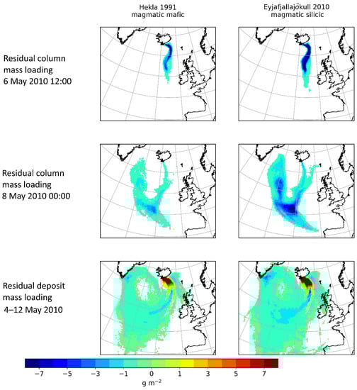 Residual mass loadings derived by subtracting the modelled mass loading using the VAAC default PSD from the result with either the coarse (Hekla 1991; left) or fine (Eyjafjallajökull 2010; right) PSD. The top two rows are residual total column mass loadings (in the air) on 6 May 2010 12:00 UTC and 8 May 2010 00:00 UTC (see Figure 10 for equivalent non-residual maps); the bottom row is residual deposit mass loadings (on the ground) for the period 4–12 May 2010 (see Figure 12 for equivalent non-residual maps).