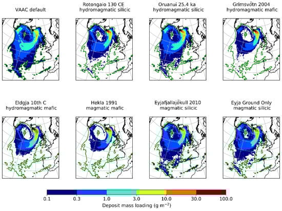 Deposition for the period 4–12 May 2010 using a range of input PSDs. The extent of the simulated deposit using the VAAC default PSD is shown as a green outline on each plot.