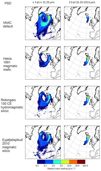 Particles ≤ 5 Φ (≥ 31.25 µm) reached distances up to ~1500 km from source (Figure 13), highlighting a limitation of using remote sensing alone when compiling grain size distributions, as satellite retrievals are usually not configured to identify such large particles [19]. For the smaller particles (> 5 Φ, < 31.25 µm), using the VAAC default PSD results in a more extensive deposit with higher mass loading of ash, and the difference is largest when compared with using the coarsest (mafic/intermediate) PSD (Hekla 1991). In this case, the VAAC PSD is likely to substantially overestimate the extent of the plume and the distance travelled by the small particles before deposition, because there is too much mass on small particles.
