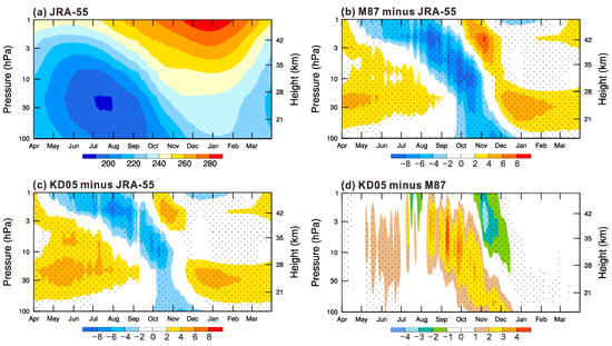 (a) Climatological seasonal cycle of Antarctic polar cap (60°–90° S) temperature (K) from JRA-55 daily data; (b) difference between M87 and JRA-55; (c) difference between KD05 and JRA-55; and (d) difference between KD05 and M87. Stippling denotes differences are statistically significant at the 95% confidence level.