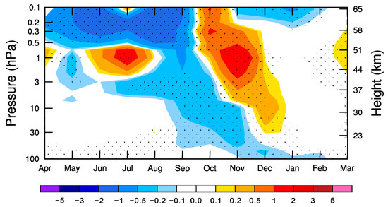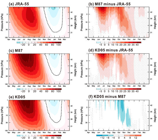 The cold-pole bias in the M87 simulation is significant. Figure 1 presents a comparison of Antarctic temperature averaged over the polar cap (60°–90° S) between the M87 simulation and JRA-55 reanalysis data. Figure 1a shows the JRA-55 daily climatology in the period of 1979–2012, and Figure 1b shows the difference between M87 and JRA-55. Stippled areas in this and similar comparisons denote differences that are statistically significant at the 95% confidence level, computed using a Student’s t test. The cold bias, which descends from the upper to the lower stratosphere in Antarctic late winter to spring (August–November), ranges from about −2 K to −8 K being significant at the 95% level, associated with the delayed breakdown of the stratospheric polar vortex in the M87 simulation. Results from KD05 present a roughly similar bias (Figure 1c). In detail, the modification of the orographic gravity wave parameterization has a remarkable influence on the temperature climatology in the Southern Hemisphere. Figure 1d shows the difference in the seasonal cycle of polar cap temperature between KD05 and M87. From August through November, much of the systematic cold bias has been reduced in KD05 by more than 2 K compared to M87. These differences between KD05 and M87 are significant at the 95% level. The remaining cold bias indicates that, despite the remarkable improvement of the temperature climatology, the breakdown of the southern polar vortex in the stratosphere still lags the observed behavior. Note that the comparisons shown in Figure 1b, 1c, and 1d are based on daily climatological averages for the period 1979–2012, and present sub-month perturbations which are closely associated with planetary wave modulation.