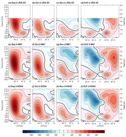 Latitude-height cross sections of zonal-mean zonal wind (m s−1) in (a–d) JRA-55, (e–h) M87, and (i–l) KD05 for (a,e,i) September, (b,f,j) October, (c,g,k) November, and (d,h,l) December–February. Contour interval is 10 m s−1. Zero winds are denoted by the black thick lines.