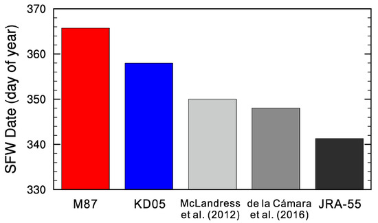 Mean final warming dates at 50 hPa for the M87 experiment (red), KD05 experiment (blue), and JRA-55 reanalysis (black) for 1979–2012. The final warming date is here defined by when the zonal mean zonal wind at 60° S and 50 hPa drops below 10 m s−1 and remains so for the duration of the summer. Results from McLandress et al. (2012) [11] and de la Cámara et al. (2016) [12] are included for reference.