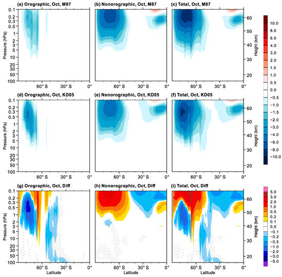Latitude-height cross sections in the stratosphere of (a,d) orographic, (b,e) nonorographic, and (c,f) total GWD (m s−1 day−1) in the M87 and KD05 experiments for October. Differences (KD05 minus M87) in gravity wave drag are shown in (g–i). Total GWD is the sum of the orographic and nonorographic GWD. Stippling denotes differences are statistically significant at the 95% confidence level.
