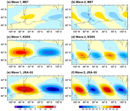 Distribution of the 100-hPa meridional heat flux (K m s−1) by the zonal wave number 1 (a,c,e) and zonal wave number 2 (b,d,f) at Southern Hemisphere high latitudes for October.