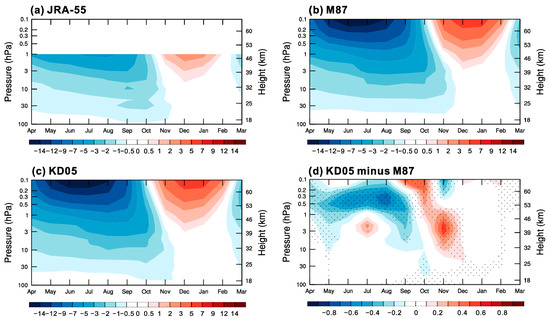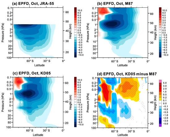 Resolved wave forcing (m s−1 day−1) in (a) JRA-55, (b) M87, (c) KD05, and (d) the differences between KD05 and M87 for October. Resolved wave forcing is expressed by the Eliassen–Palm flux divergence (EPFD). Stippling denotes differences are statistically significant at the 95% confidence level.