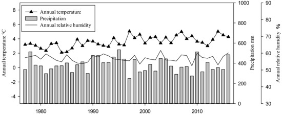 3.5. Relationships between δ13C of Different Sites and Annual Temperature, Relative Humidity and Annual Precipitation