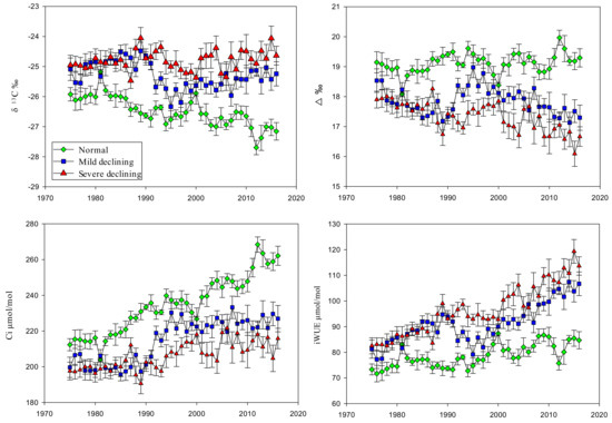 - Liu, X.; Wang, W.; Xu, G.; Zeng, X.; Wu, G.; Zhang, X.; Qin, D.J.T.P. Tree growth and intrinsic water-use efficiency of inland riparian forests in northwestern China: Evaluation via δ13C and δ18O analysis of tree rings. Tree Physiol. 2014, 34, 966–980. [Google Scholar]
