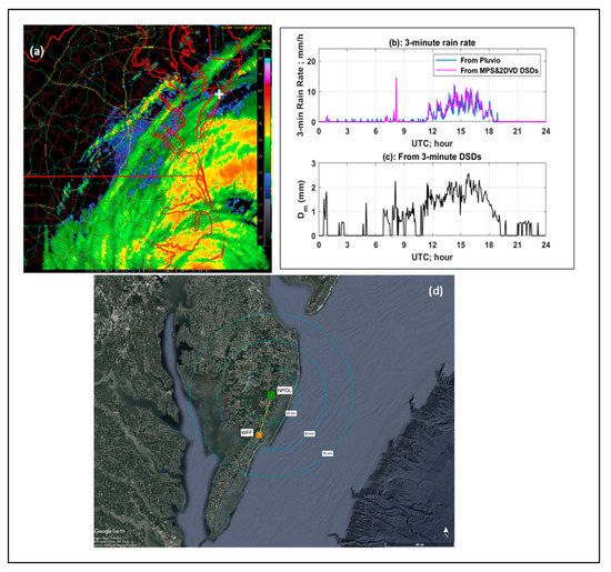 The instrument site is part of the ground validation activities in support of NASA’s global precipitation measurement (GPM) mission [22]. A network of many ground instruments with multiparameter radar observations not only provide pertinent data for validating GPM-based products, but also enable studies on precipitation microphysics. The ground instruments include various types of disdrometers and rain gauges. Here, we utilized data obtained from two disdrometers, namely a meteorological particle spectrometer (MPS) [23,24,25] and a 2D video disdrometer (2DVD) [26,27], as well as a Pluvio rain gauge [28], all collocated at the same coastal region. The MPS was installed within a double wind fence (DFIR) [29] in order to reduce the effects of high winds on DSD measurements. This setup was similar to that of two other sites, one in Greeley, Colorado, and one in Huntsville, Alabama (see Figure 1 of [30]). While the MPS enabled relatively accurate measurements of drop concentration for drop diameters below 1.2 mm, the 2DVD provided more accurate measurements for larger diameters( >0.7 mm). As with Greeley and Huntsville data analyses, we composited drop size distribution from each instrument (typically 3 min averaged) using the MPS for D < Dth and the 2DVD for D ≥ Dth, where Dth is a threshold diameter in the overlap range from 0.75 to 1 mm [31]. Due to high gusting winds, the data quality of the MPS concentrations for D < 0.5 mm could not be firmly established; so, to be conservative, we used 0.5 mm as the lower limit for the MPS. Further Dth was selected as 1 mm; thus, by combining data from two disdrometers, truncation at the small drop end was partially overcome. The composite DSD that resulted was considered to be a substantial improvement over using a single 2DVD alone.