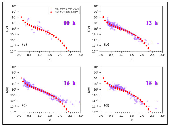 h(x) versus x derived from 3 min DSDs for (a) 00:00, (b) 12:00, (c) 16:00, and (d) 18:00 UTC, shown as purple crosses. Red diamonds represent most probable h(x) versus x from composite DSDs from the Greeley (GXY) and Huntsville (HSV) datasets with more than 4000 3 min DSDs from a variety of rain types [31].