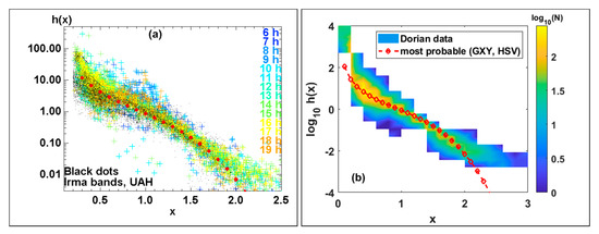 The double-moment normalized spectra from 06:00 to 20:00 UTC are all plotted in Figure 3a. There was considerable similarity with Figure 7a in [17], which also used i = 3 and j = 4. The composite h(x) (from GXY and HSV, plotted as red diamonds in Figure 2) is also shown. Black points represent the h(x) derived from 3 min DSD data in the outer bands of hurricane Irma that produced 8 h of rainfall at the HSV site. These are in reasonable agreement with data from the Dorian rainbands, although the composite h(x) lay slightly closer to Irma than Dorian data, especially for x > 2. A color-intensity plot of the Dorian-based h(x) is shown in Figure 3b with the composite h(x) curve from HSV and GXY; once again, the agreement for 0.25 < x < 2.0 is very close.