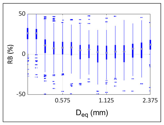 To illustrate this more quantitatively, in Figure 4 we show the boxplot of the resulting bias (defined as Δ = Dorian − “reference”) in drop concentration, N(D), expressed in terms of relative bias (Δ/mean(“reference”)), if we assume the h(x) derived for the GXY and HSV data is the “truth”. Recall that N(D) = N0’ h(x). The central mark is the median, edges represent the 25th and 75th percentiles, and outliers are plotted individually. Up to 4 mm drop diameters, the relative bias was less than 50%, although the median values tended to be slightly positive (x-axis scale is not uniform). Between 0.5 and 4 mm, the use of the most probable h(x) from GXY and HSV especially resulted in very close representation of the Dorian DSDs. With the caveats mentioned earlier with reference to high gusting winds affecting concentrations for D < 0.5 mm, the use of the composite h(x) results in underestimation of Dorian drop concentrations by about 20–30% (except for the smallest size considered here, which may have had relatively large measurement errors associated with them).
