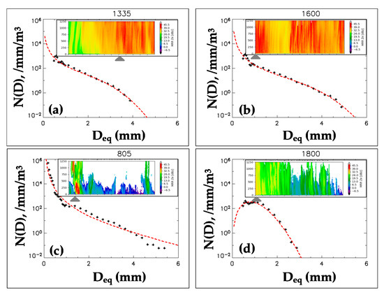 Four examples of 5 min DSDs (plus points) and their fitted generalized gamma (GG) curves (red dashed lines) for (a) 13:35–13:40, (b) 16:00–16:05, (c) 08:05–08:10, and (d) 18:00–18:05 UTC. Collocated micro-rain-radar (MRR) observations are included as an inset in each panel. Grey arrows represent the corresponding start times of the DSDs.