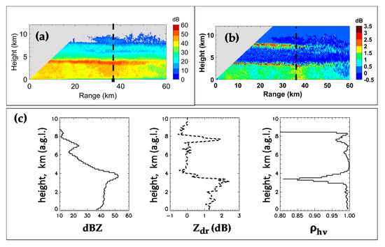 Figure 6a,b shows the Zh and Zdr from NPOL RHI scan taken along the azimuth of the disdrometer site at 15:41 UTC, which was around the time when Dm from the ground-based DSDs reached a maximal value of almost 2.5 mm. Figure 6c shows height variations above the disdrometer site (data averaged over a 1 km range interval centered at 38 km range). The range to the disdrometer site is marked by a vertical black dashed line. The bright-band (BB) was clearly visible at 4 km AGL in Zh, but significantly less visible in Zdr (i.e., smaller enhancement in the bright band relative to rain below). The Wallops sounding at 15:00 UTC showed that the height of the 0 °C was 4.4 km, surface temperature was 22 °C, and relative humidity was 94%. A remarkable feature was the high value of peak Zh in the BB (nearly 55 dBZ) with around 11 dB fall off in the rain below. The vertical extent of the bright band (in Zh) was quite deep, around 750 m over the disdrometer site. These values are unusual relative to the statistics derived in [36], although their study utilized an X-band radar. Drops as large as 5 mm were recorded by the 2DVD. Gatlin et al. [37] found that stratiform rain with a thick bright band (often associated with larger melting snow particles) tends to produce larger drops; even so, 5 mm drops are relatively rare in non-convective events.