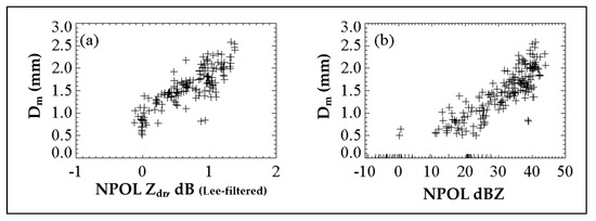 Mass-weighted mean diameter from 3 min DSDs versus (a) NPOL-based Lee-filtered Zdr and (b) NPOL-based Zh over the disdrometer site.
