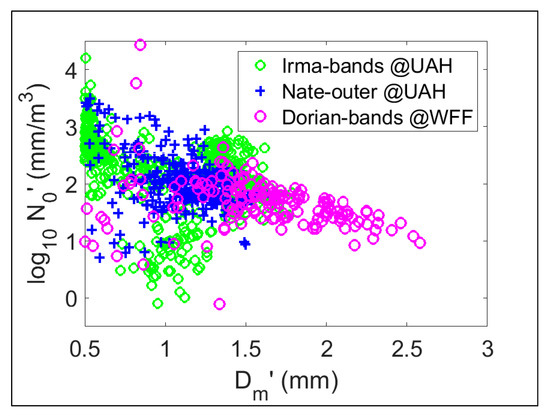 N0’ versus (same as Dm) from 3 min DSD for Dorian rainbands compared with those from the outer bands of hurricane Irma and from outer bands of tropical depression Nate, both at HSV.