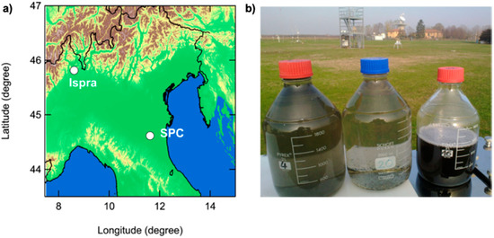 Measurements discussed in this paper were performed at two rural sites in the Po Valley, San Pietro Capofiume (SPC) and Ispra (Figure 1a). The Po Valley, Northern Italy, is a highly polluted region [10], due to significant anthropogenic emissions from both the agricultural and industrial sectors and from transportation. In addition, one fourth of the national population lives in this area, with a population density almost double the national average. Finally, the valley is surrounded to the north, west, and south by mountain ranges that prevent pollution dispersion and favor accumulation, especially during the cold season.