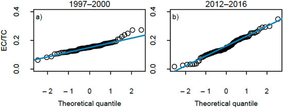 In order to verify the similarity of the two datasets when EC measurements are available (before 2000 and after 2012), we first tested the normal distribution of EC to TC ratios, and then performed the Welch t-test. Figure 3 shows the Q-Q plot of EC/TC ratios observed during the two periods, reporting on the y-axis the measured ratios, and on the x-axis the distribution of the data around the mean (quantified by z-scores or number of standard deviations). The plots indicate that in both periods, the ratios were distributed around the mean with a variability of about two times its standard deviation. Over the period 1997–2000, the distribution was skewed towards larger values, showing outliers. After removing the outliers observed during the first part of the experiment (4 out of 73 samples), which could possibly come from the different analytical method used at that time, the Welch t-test indicates that the two periods showed identical EC to TC ratios at a confidence interval of 99.95%.