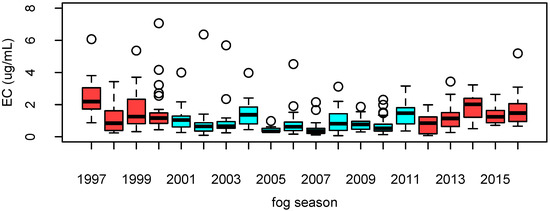 An accurate determination of EC scavenging efficiency would require the comparison of atmospheric EC concentration right before and after fog formation [12]. In this study, we are more interested in identifying a conversion parameter to extrapolate atmospheric seasonal variability of atmospheric EC concentrations from long-term fog composition measurements. With this purpose, we calculated the average values of EC concentration in PM2.5 aerosol samples, over each whole fog season (from November to March), and compared them with the seasonal averages of EC fog water concentration, adjusted for LWC. The ratios vary between 0.16 and 0.49, with an average of 0.28 ± 0.05. Based on this conversion factor, we derived the EC atmospheric concentration from fog water composition back to 1997.