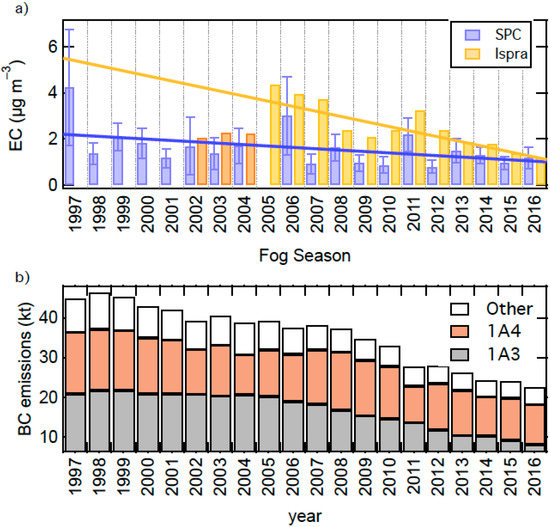 Figure 5. (a) Trend of atmospheric EC average concentration estimated from fog water composition in SPC (blue bars) and from direct EC measurements in Ispra from November to March of the following year (dark orange bars for 2002–2004 seasons, and light orange bars for 2005 and following seasons); (b) trend of national black carbon emissions from 1997 to 2016, compiled by the Institute of Environmental Protection and Research (ISPRA); contributions from non-industrial combustion (1A4 in brown) and road transport (1A3 in grey) are highlighted.