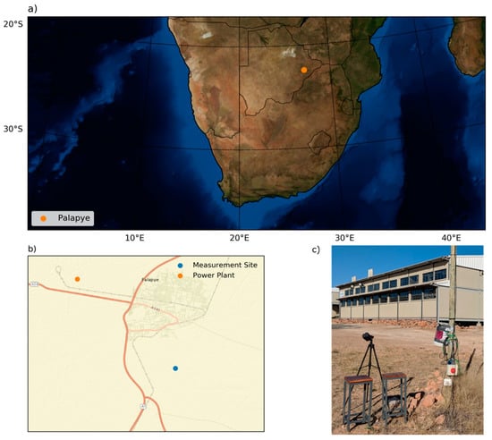 The measurements were made on the campus of the Botswana International University of Science and Technology (BIUST) located in Palapye, Botswana. Palapye is a village located at 22.59° S, 27.12° E, more than 150 km from the nearest major metropolitan area (Figure 1) within a semi-arid climate zone characterized by hot and dry weather, with less than 300 mm of precipitation annually. The measurements were made between 19 June and 20 July 2018, corresponding to southern hemisphere winter. Daytime temperatures generally ranged between 25 and 30 °C, with nighttime lows between 0 and 6 °C. There was little or no cloud cover during our measurement period. However, from 5–10 July, the weather was overcast and cool with some light precipitation, associated with a synoptic-scale system [19]. The area surrounding Palapye consists of arid shrubland with sandy soils. Blowing and suspended dust from arid soils is an important source of coarse-mode particulate matter in this region [20], though traditionally dust is not a major source of PM2.5. Livestock is a major part of Botswana’s economy [20], and this land is frequently used for cattle grazing as well. Cattle and other livestock can be a source of ammonia, which is a precursor for PM2.5 [21,22,23].