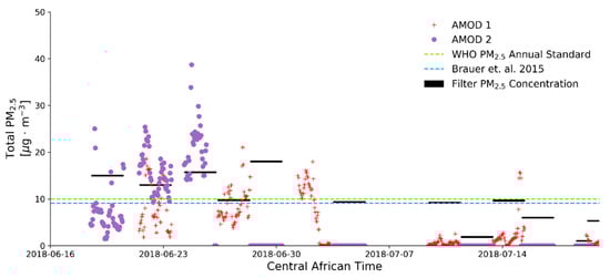 First, we present the PM2.5 time series from the AMOD devices in Figure 2: the real-time Plantower observations are denoted by the points, distinguishing between the two AMOD instruments; the filter observations are denoting by the horizontal black lines with the width representing the duration of the measurement period (all measurements were for 48 h except for the last two, which were 24 h duration). As shown in the timeseries, the Plantower sensor on AMOD 2 was offline after the third deployment of that sensor. Additionally, the sensors were not deployed during the overcast/raining period from 5 July to 10 July.