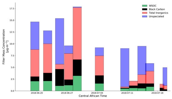 In Figure 2, the filter and Plantower measurements both show that the PM2.5 concentrations before (18 June–4 July) are generally greater than the concentrations after the overcast period (10–20 July). The average concentration during the first half of the measurement campaign was 14.0 µg∙m−3, as compared to 6.5 µg∙m−3 during the second half of the measurement period, according to the filter-based measurements. In Figure 2, we have overlaid the World Health Organization (WHO) [35] standard for annual average PM2.5 concentrations (10 µg∙m−3) and the estimates for the 10 km by 10 km box around our measurement site in the 2015 GBD report (9.1 µg∙m−3). The actual average concentration during this time period was 9.4 µg∙m−3, which is very close to the GBD estimate and below the WHO annual limit [4]. However, given the limited duration of our measurements and high variability in the concentrations we observed, it is difficult to conclusively determine the actual mean concentration, or whether the “high-concentration period” or “low-concentration period” is more common in Palapye, or how these may vary seasonally. Therefore, we will attempt to use other information to identify the mechanism for this variability, in order to extract some more generalizable information about air quality in Palapye. In addition to our measurements of mean PM2.5 concentration, we also have the characterization of the filters that we collected to provide some information on the PM2.5 composition. Additionally, we can use the Plantower and MicroAeth observations to learn about the daily variability in PM2.5 and black carbon, an important tracer for combustion. We will discuss the composition information in Section 3.2 and the temporal variability in Section 3.3.