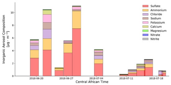 The most important single constituent of the aerosol by mass is the inorganic ionic fraction of the aerosol. The mass concentrations for the common ionic aerosol species from the ion chromatography characterization are shown in Figure 4. By mass, sulfate is the most abundant ionic species in the particle phase, followed by ammonium. Sulfate and sulfuric acid is most commonly formed from the oxidation of SO2 by two oxidation pathways: gas-phase oxidation by OH radical, and aqueous-phase oxidation inside cloud droplets. These two processes have very different timescales associated with them; the gas-phase mechanism has a lifetime of approximately 1 week, while the aqueous-phase mechanism is much faster. Given the lack of clouds in the region during the first two weeks, the gas-phase mechanism is likely dominant for this measurement site during this time period. While the Moropule Power Plant is located within 10 km of the measurement site, and is likely a large regional source of SO2, it is unlikely that the oxidation of SO2 is occurring quickly enough to produce lots of sulfate at the measurement site. To produce the observed mass of sulfate so close to the source of SO2, either the air in the region must have stagnated to prevent ventilation of SO2 emissions, allowing the production of sulfate over a period of a few days. While there is evidence that some stagnation occurred during the first half of the measurement period, the prevailing winds never directed emissions from the powerplant to the measurement site. However, another possibility is that the measured sulfate is regional background. South Africa generates much more electricity annually than Botswana, including electricity that is exported to Botswana and other surrounding nations. Due to South Africa’s possession of rich coal deposits, coal-fire power plants are ubiquitous in the north east of the country. Previous modeling studies have shown that the prevailing wind during summer is easterly and northeasterly over Botswana thereby allowing transport of biomass burning aerosols from northeastern parts of South Africa [37,38]. In [38], biomass burning aerosol from northeastern and central parts of South Africa is shown to be an important regional source of aerosol during summer. However, as compared to other events, such as various anthropogenic activities in South Africa, open biomass burning activities emit lower amounts of SO2 during this time of the year [39]. Therefore, it is not obvious that advection of the regional sulfate from the east and northeast of South Africa could account for a substantial fraction of the observed sulfate in Palapye.
