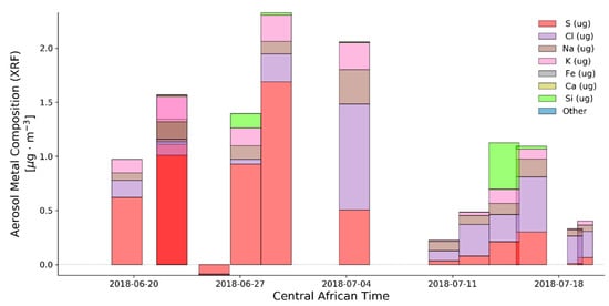 In addition to the IC analysis, we conducted x-ray fluorescence (XRF) analysis of the filters to identify the metallic species present in the aerosol; the results of the XRF analysis are shown in Figure 5. Many of the atomic species detectable by the XRF analysis are also present in ions detected by IC. If the IC ions dominate the form of the XRF atom (e.g., low amounts of organic sulfur), the XRF and IC analysis may agree. For example, the mass of sulfur atoms obtained via XRF agrees well with the mass of ionic sulfate, as determined via the IC. Likewise, there is agreement for Cl and Na species from the two methods. However, the XRF also allows us to see the quantity of silicon and iron in the aerosol, which are tracers for dust in this region. Based on the results in Figure 5, the dust in this region is not important for PM2.5 particles. However, this does not preclude that suspended dust is present in coarse particles, and dust is known to be important in this region for climate radiative effects and visibility [20,48].