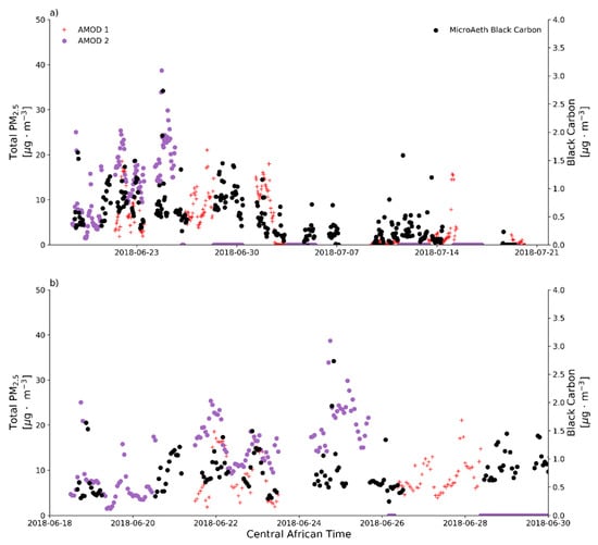 In addition to the filter samples, we use the Plantower real-time PM2.5 measurement, along with the MicroAeth black carbon measurements to investigate the diurnal variability in the aerosol at the BIUST measurement site. We plot the Plantower data for the entire time period in Figure 6a with the black carbon concentrations using a different scale on the second Y axis. In Figure 6a, we see that the concentrations for total PM2.5 were much higher during the first half of the time period, and comparatively lower during the second half, which is corroborated by the filter-based measurements as described above. There appears to be a difference in black carbon concentrations, but it is much less pronounced than the difference in total PM2.5. We will revisit this difference between the first and second halves of the measurement period shortly.