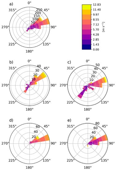 Windroses: (a) total time period; (b) first half, day; (c) first half, night; (d) second half, day; (e) second half, night.