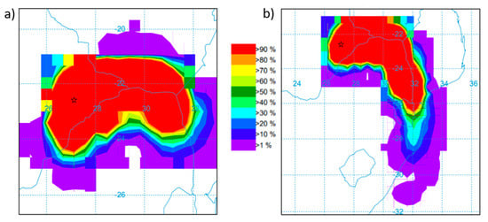 During the period between 3 July and 8 July during the second half, much of southern Africa experienced cold temperatures and anomalous precipitation due to synoptic weather activity [19]. The cold front passage removed pollution by precipitation and allowed cleaner air to mix into this region. In Figure 8, we plot 24-h HYSPLIT back-trajectories for the two time-periods (Figure 8a shows the first half of the measurement period, Figure 8b shows the second half, note the different spatial scales of the two figures). In Figure 8a, we see that most of the trajectories originate in a very comparatively small spatial area, while in Figure 8b, many of the trajectories originate as far away as South Africa. While the trajectories tend to originate to the east of the measurement site in both cases, the trajectories travel over twice as far in 24 h during the second half. This faster moving air more effectively dilutes emissions. It is possible that during the first half of the measurement, before the frontal passage, a period of regional stagnation allowed local pollution to build up in Palapye. The smaller area of origin for air masses impacting Palapye during the first half of the time period suggests that regional stagnation may be a factor in the relatively larger concentrations of PM2.5 at our measurement site during this time. Therefore, comparisons to remotely sensed products, such as MODIS Aerosol Optical Depth (AOD) could be useful for investigating the importance of stagnation at this location.