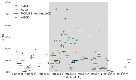 MODIS AOD retrieval from Terra (blue) and Aqua (orange) overpasses for Palapye (points) as well as the surrounding 100 km average (black), with AMOD AOD at 520 nm overlaid (green crosses). The shaded gray area refers to the duration of the measurement campaign.