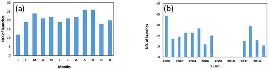 Number of ozonesondes launched at Irene from 2000 to 2015, expressed (a) monthly and (b) annually.