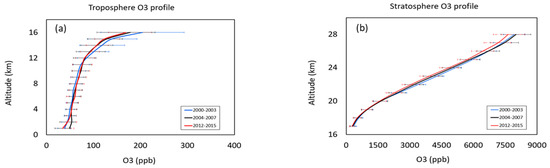 Ozone troposphere (a) and stratosphere (b) profiles. The blue line indicates 2000–2003 averages, black line indicates 2004–2007 averages and red line indicates 2012–2015 averages. The error bars indicate the standard deviation.
