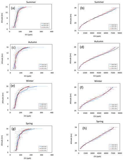 Figure 3 shows the O3 seasonal vertical profiles averages for the troposphere and stratosphere. In the year 2012–2015, summer experienced high O3 increase from 5 km to 12 km (Figure 3a). On the other hand, 2000–2007 experienced high O3 mole fractions in the lower troposphere (Figure 3a,c,e,g), with the increase noted up to 8 km during the winter (Figure 3e). On the other hand, O3 decrease was observed in the upper troposphere and lower stratosphere, with 2012–2015 experiencing lower mole fractions compared to 2004–2007 and 2000–2003 (Figure 3b,d,f,h). In general, a continuous non–consistent O3 decrease occurred from the upper troposphere (above 16 km) to lower stratosphere (28 km) for all seasons. These results suggest that the observed O3 decrease in the lower stratosphere is independent of season. Whereas, O3 increase between 1.5 and 4 km could be related to increase in urban influence boundary layer precursors [46]. Such O3 precursors could originate from domestic heating and power stations. Maximum standard deviation is observed at altitudes closer to tropopause region. Such increase could be related to STE and other dynamic changes occurring in the tropopause region. This variation was observed to be lesser in summer when compared to other seasons. Sivakumar and Ogunniyi [38] reported similar observations of higher standard deviation closer to the tropopause height.
