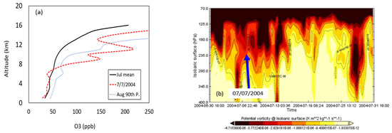 (a) Ozone troposphere profile over Irene on 07 July 2004. (b) Potential vorticity at Isobaric surface over Irene on July 2004 (from MERRA-2). Solid line in Figure 4a indicates monthly O3 average composite, broken line indicates O3 event and dotted line indicate 90th percentile composite. Colours in Figure 4b indicates the level of potential vorticity, black indicates high potential vorticity of more than 3 Km−2 kg−1s−1 while yellow indicates potential vorticity of less than 2 Km−2 kg−1s−1. Blue arrow in Figure 4b indicates the event that is associated with O3 profile in Figure 4a.